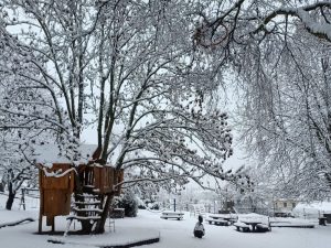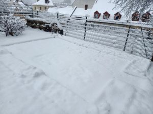 In unserem Garten sieht es wunderschön aus, wie im Winter-Wunderland. wir können endlich einmal wieder mit den Po-Rutschern den Berg hinab sausen und Schneemänner bauen.