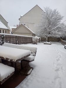 In unserem Garten sieht es wunderschön aus, wie im Winter-Wunderland. wir können endlich einmal wieder mit den Po-Rutschern den Berg hinab sausen und Schneemänner bauen.